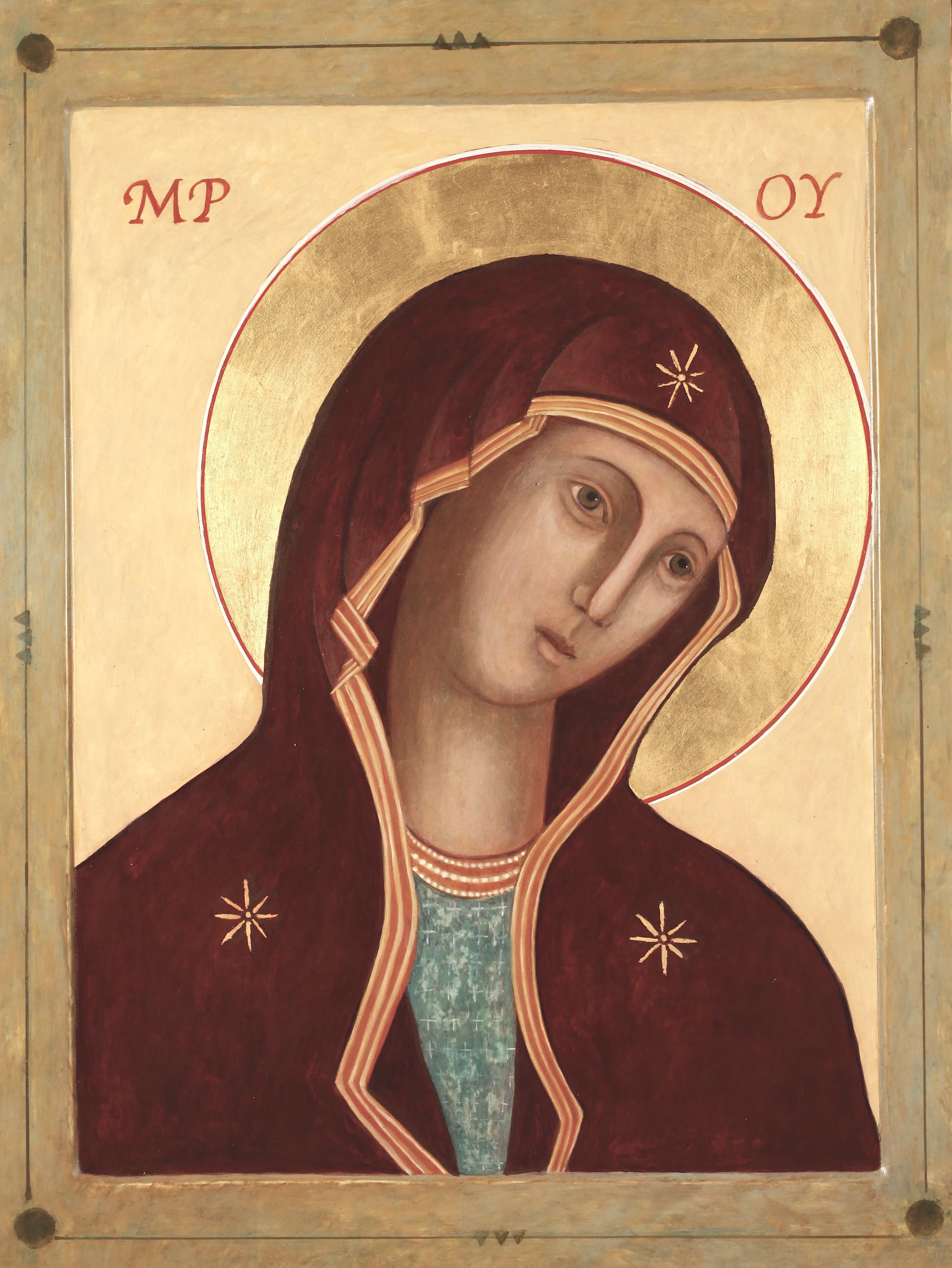 In Orthodox iconography, Mary’s veil is deep red, the color of divinity, while the clothes under the veil are either green or blue, the colors of humanity. This is the opposite of the usual depiction of Christ’s robes’ colors. In western religious art depictions of Mary, her robes usually are a light blue. It’s always important to include the names of saints in icons, and icons of Mary usually have the letters “MP OY”, an abbreviation of the Greek: “Mater Theos” – the Mother of God to identify her. The lily represents her purity and virginity while the rose stands for her love and beauty. These symbols invite the viewer to reflect on Mary’s unique holiness and place within God’s plan for man’s salvation.