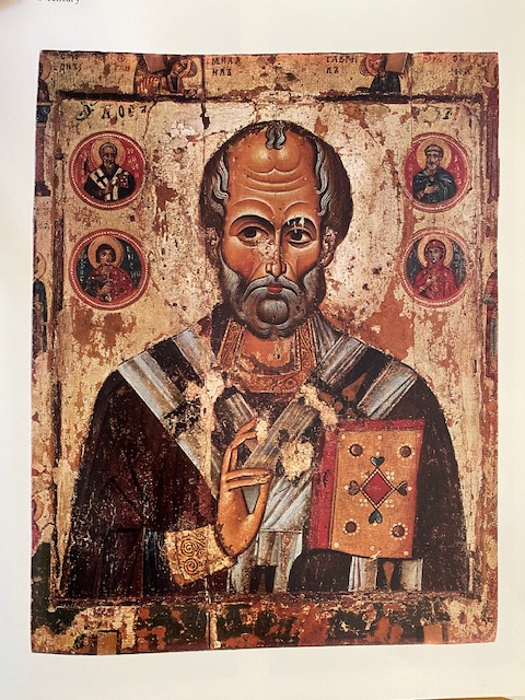 In the thirteenth century icon of Saint Nicholas from the Novgorodian monastery of the Holy Spirit, we see clearly the simplicity of composition, the harsh linear forms, and sparse contrasting colors that complement the restraint of the image. This icon, as well as the is very characteristic of Novgorodian twelfth and thirteenth century painting.