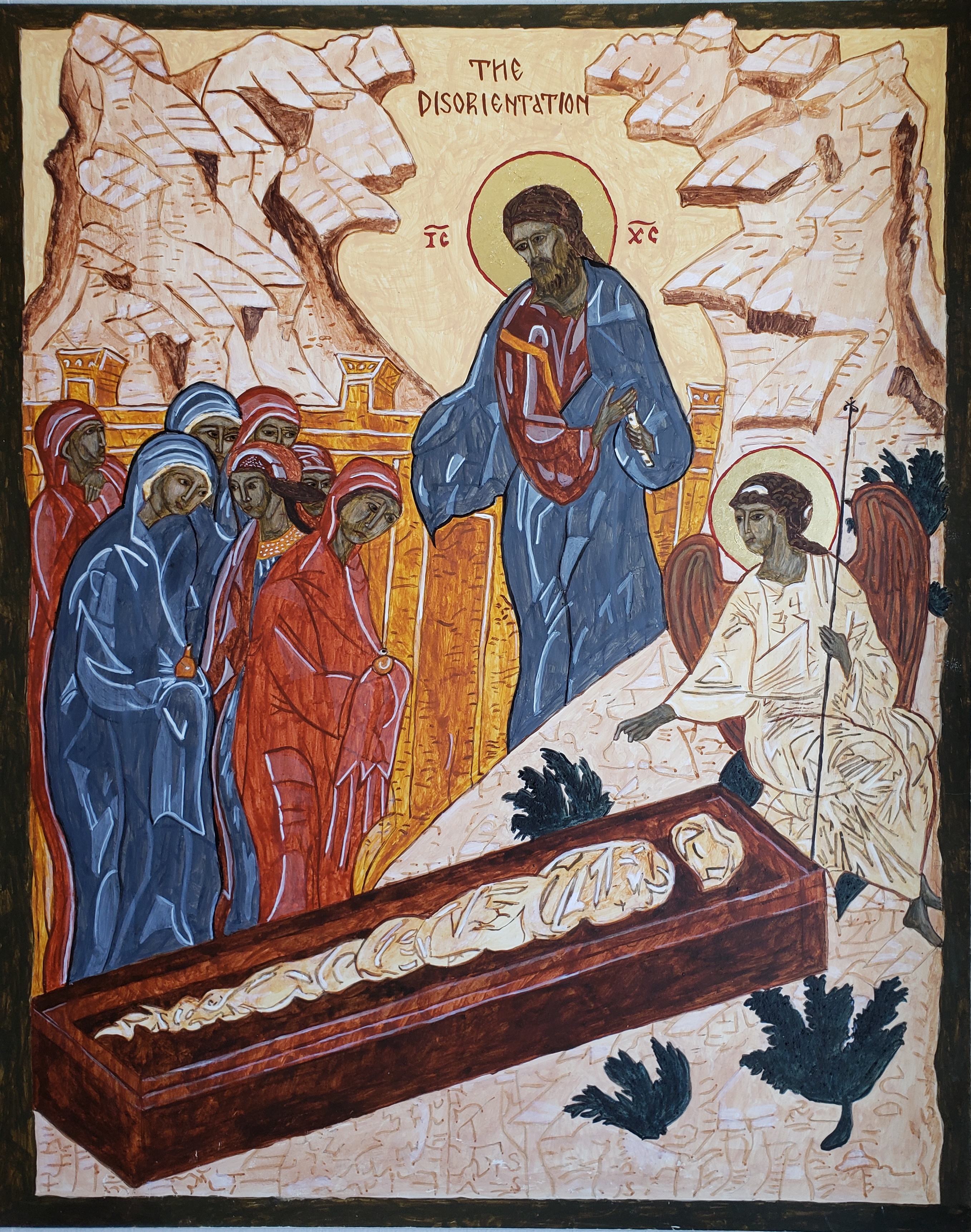 This is another 16×20” icon, and a sequel to “The Lamentation.” Jesus is now risen from the dead, leaving only His graveclothes behind, so I am surprised this icon is never called “The Resurrection.” Of the many renderings of this icon, I chose this one because Jesus was still visibly present, even though only one of the women noticed He was there. Their focus was on the grave clothes, and so, largely, was mine. I was feeling a kind of desolation, but at least Jesus was with me.